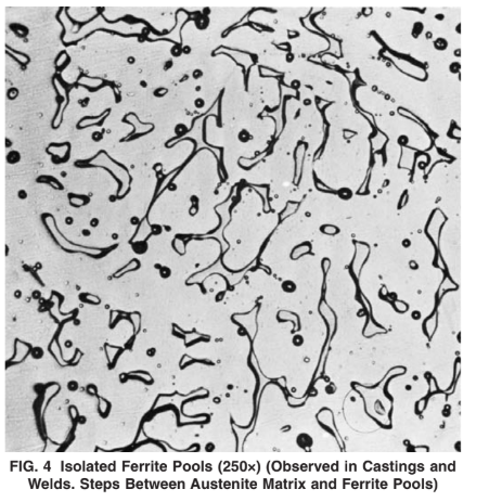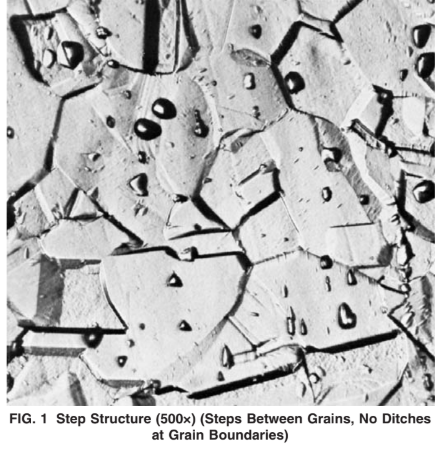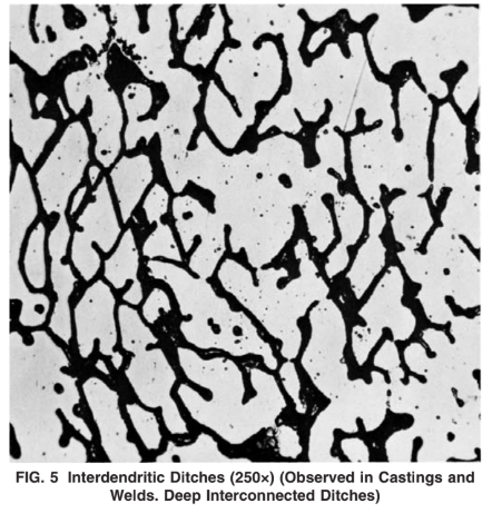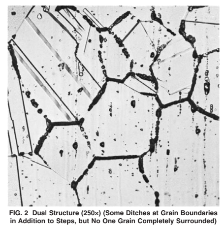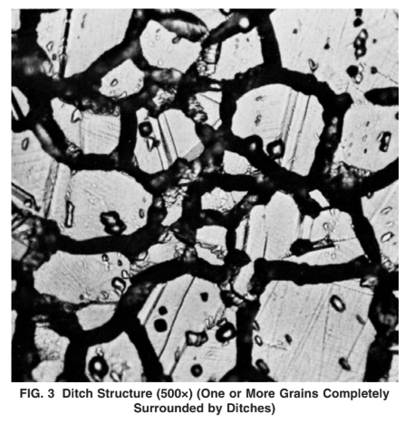 On stainless steel castings and weld metal, the steps formed between grains through electrolytic etching with oxalic acid are often less prominent compared to those observed in wrought materials. In some instances, these steps may be entirely absent. Despite this, any susceptibility to intergranular attack in such materials is readily apparent through the presence of pronounced ditches. This characteristic provides a reliable marker for evaluating castings and welds, even when step structures are minimal or absent.