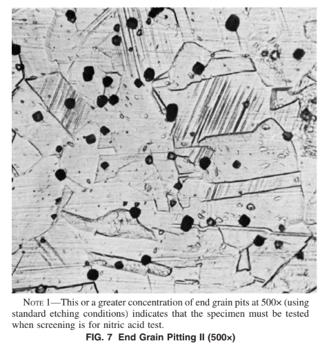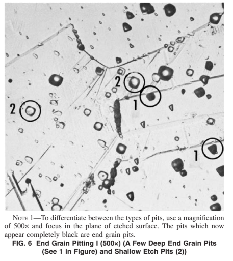 Certain wrought specimens, particularly those prepared from bar stock, may display a random pattern of pits. These pits require careful evaluation to determine their significance: